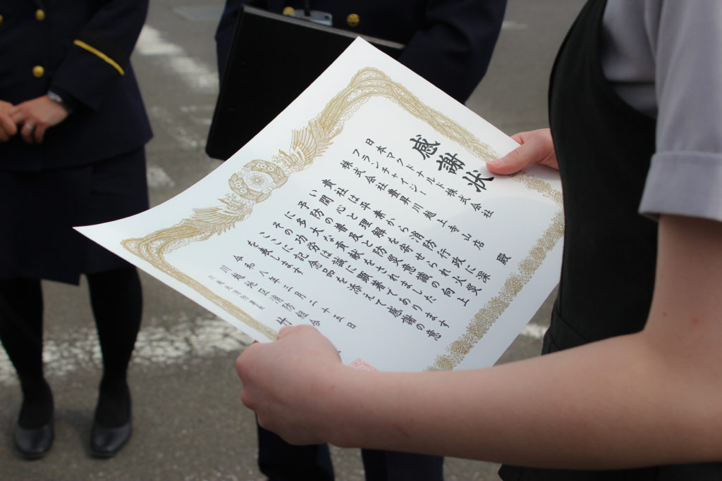 川越北消防署から表彰していただきました。