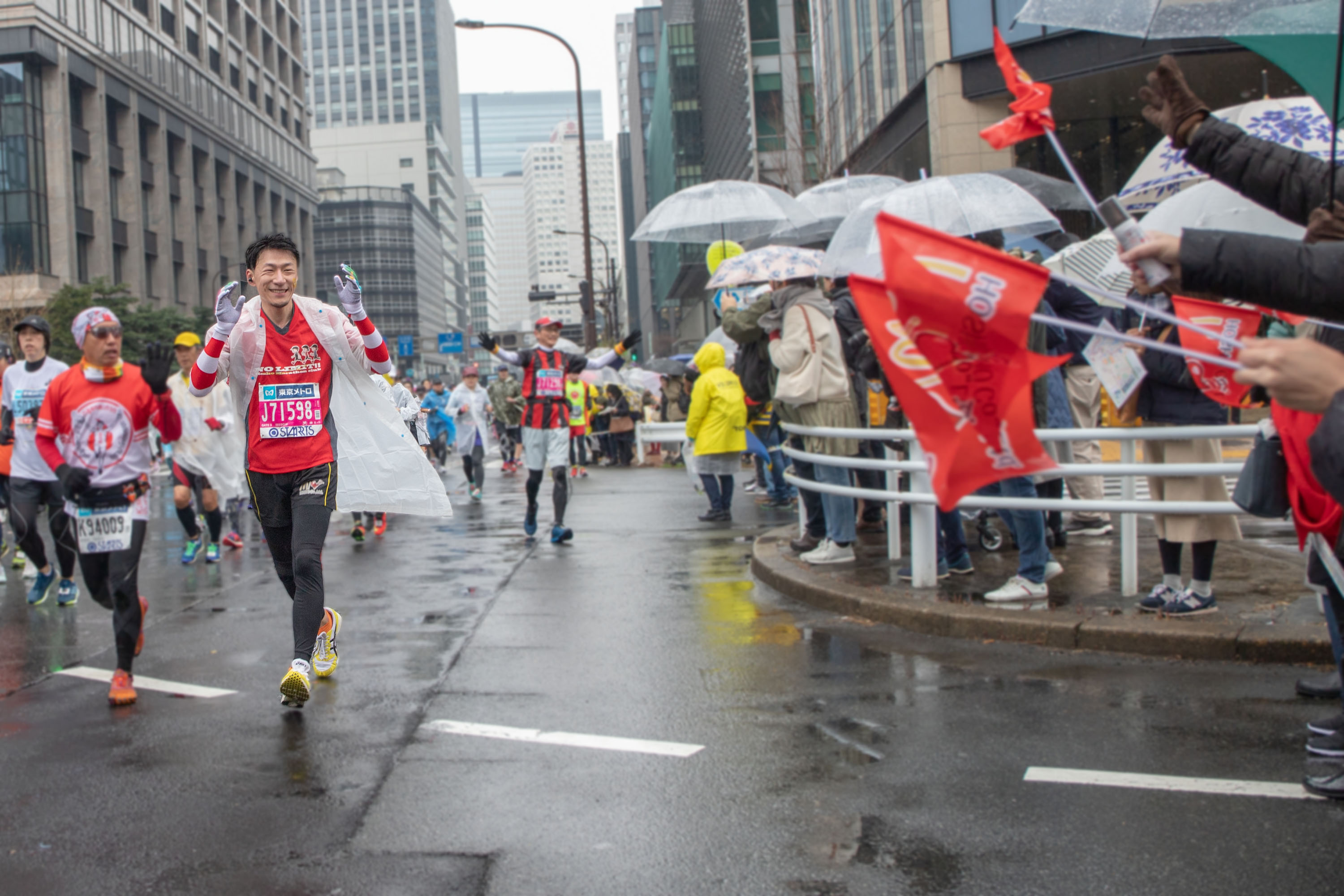 長谷川さんに続き、豊昇ランナーたちが次々と通過していきます。皆さんのこの雨の中10km走ってきたとは思えない、まさに”走れる幸せ”を感じさせるような生き生きとした表情を見せてくれました。