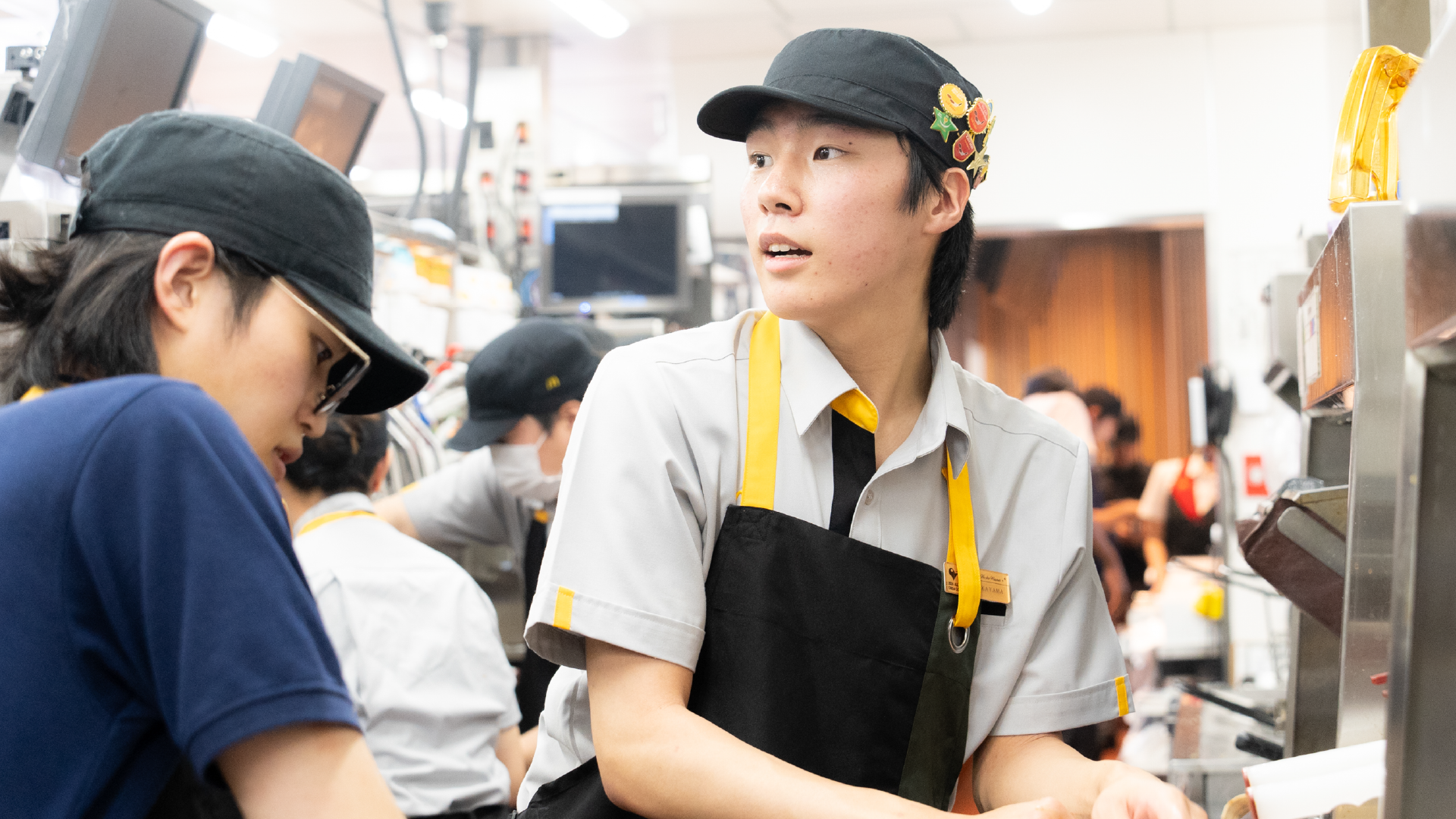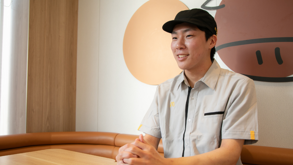 僕は普段から、とにかく”声を出す”ということを意識しています。挨拶はもちろん、混みそうなタイミングでの声かけ、一緒に働くクルーの良いところを見つけたらすぐに伝える。「今の笑顔めっちゃ良かったよ!」のような、小さなことでも言葉にして伝えることを大切にしています。
